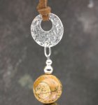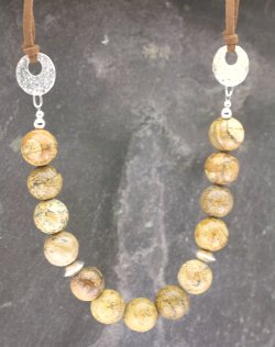13mm jasper beads with silver beads hung from two hammered silver discs on a double brown faux suede thong with silver trigger fastener. Total length is approx 57cm